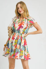 This stunning tropical print mini dress features a vibrant abstract pattern in coral, turquoise, yellow and cream colors. Made from lightweight, flowing fabric that's perfect for warm weather. The dress showcases a flattering V-neckline with self-tie detail, short ruffled flutter sleeves, and an elastic waistband that creates a comfortable yet feminine silhouette. The above-knee length and relaxed fit make it ideal for beach vacations, summer festivals, or casual day wear. The eye-catching tropical print adds a playful, vacation-ready vibe to any wardrobe.